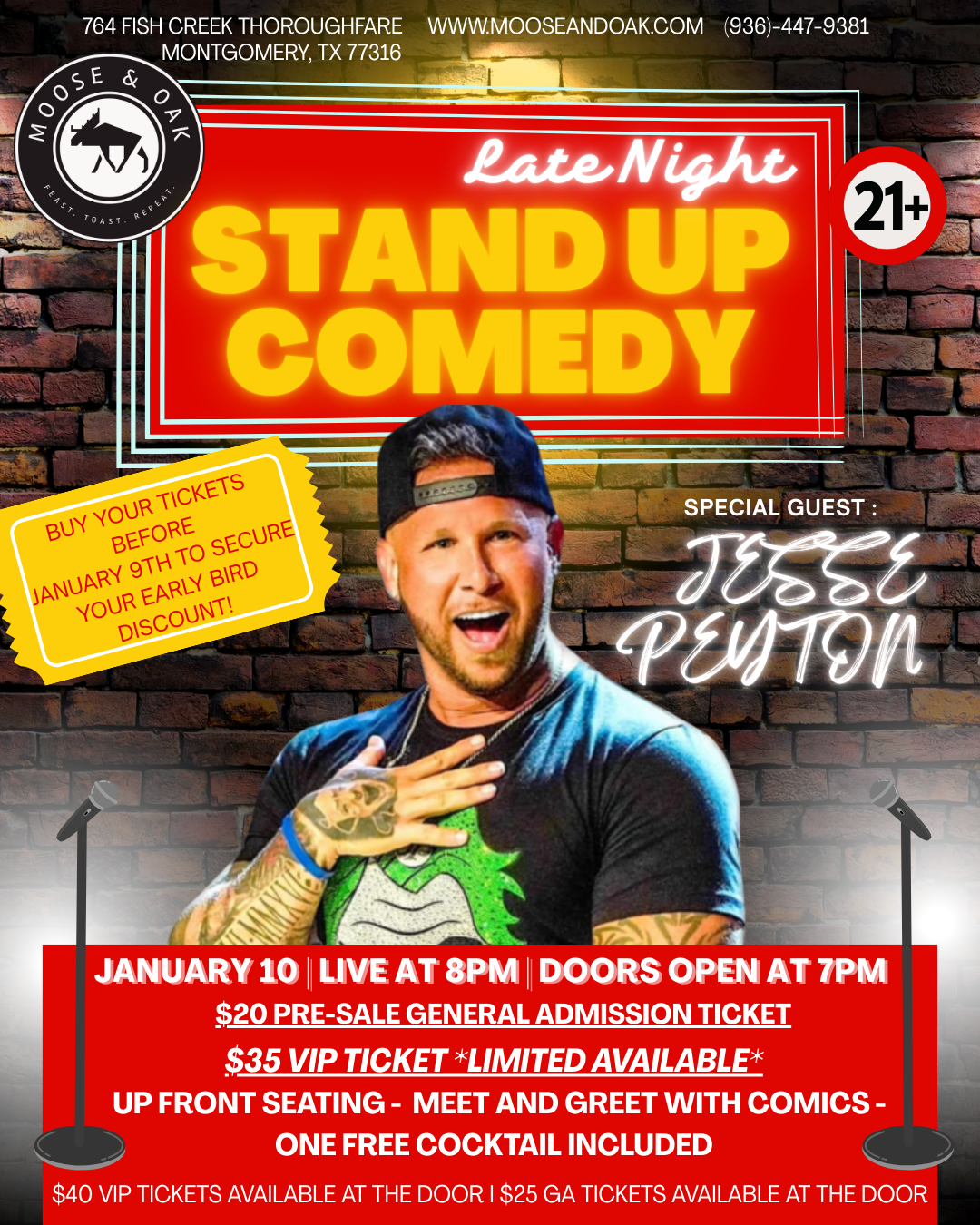 Join us for a comedy show featuring Jesse Peyton. Doors open at 7PM, show starts at 8PM.