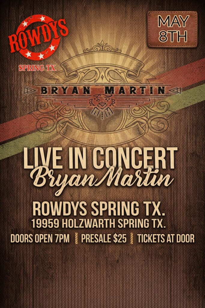 Get ready for an unforgettable night of real country music as Bryan Martin takes the stage at Rowdy’s Dance Hall in Spring, Texas.